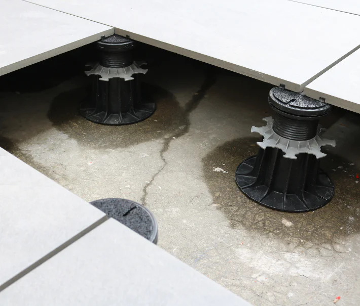 Dalles compatibles : utilisez des dalles autoportantes conformes aux classes T7 / T11 / F+ (NF EN 1339 / QB32) en usage piéton, en respectant toujours les préconisations du fabricant du dallage.